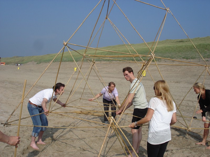 Bamboestieken is fantastische, creatieve en vooral verslavende activiteit! Met bamboestokken en elastiek is het tijd voor knutselen op een hoger niveau. Kunstwerken op basis van een aangewezen thema of in teamverband een constructie maken die je ook moet presenteren aan een ander team. Je begint met het construeren van driehoeken, vierkanten of sterren en vervolgens ga je alles aan elkaar ‘stieken' Een elastiek kan voldoende zijn maar naarmate de constructie groeit des te meer elastiek er nodig is. In alle vormen is deze activiteit uit te voeren en biedt gegarandeerd plezier!